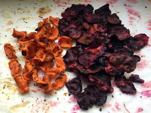 Еще один замечательный рецепт овощных чипсов в духовке получается из моркови и свеклы. Очищаем и нарезаем тонкими ломтиками среднюю свеклу и морковь, промываем их под водой и высушиваем. Сначала выкладываем на противень с пергаментной бумагой ломтики свеклы, промазываем каждый подсолнечным маслом и посыпаем специями на ваш вкус. Выпекаем чипсы при температуре 165 °C в течение 20 минут, затем переворачиваем их и ставим в духовку еще на 20 минут. То же самое проделываем с морковными ломтиками, но уменьшаем температуру запекания до 135 °C. Такое угощение особенно придется по вкусу сладкоежкам. К тому же оно невероятно полезно благодаря ударной дозе каротина, который делает зрение острее, а сердце выносливее.