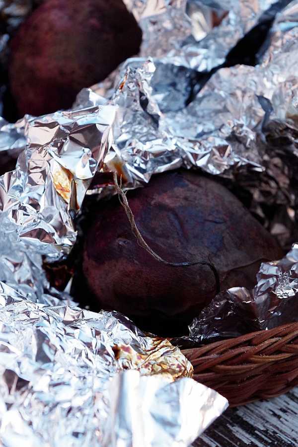 - Свеклу среднего размера (4 штуки на один лоток) помыла, не счищая кожуру и не обрезая хвостики, завернула в фольгу и в духовку – на пару часов при 180 градусах.