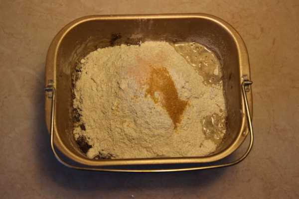 Засыпаем все ингредиенты в форму так, как указано в инструкции Вашей хлебопечки.