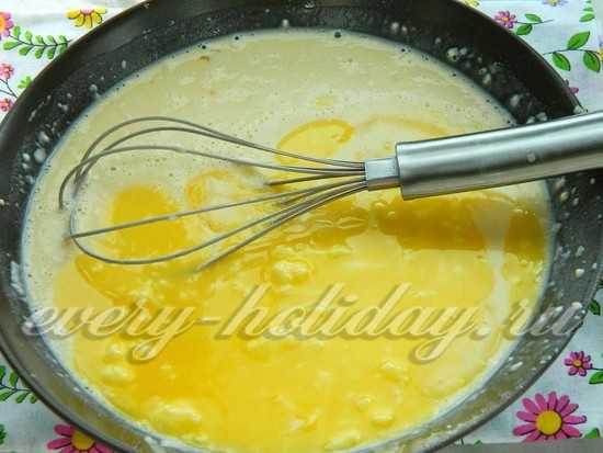 - Воду смешать с молоком и в эту смесь вбить яйца. Венчиком тщательно перемешать, присолить;