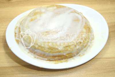 Полить блинный торт глазурью и убрать в холод на 10-12 минут.