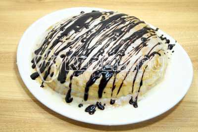 Высота вашего торта будет зависеть от количества блинов. Можно чередовать сметанный крем и крем из сгущенного молока. У меня вышло нижних слоев 15 со сгущенным молоком, остальные слоев 10 со сметанным кремом. На верхний блин выливаем остатки крема сметанного и равномерно распределяем. Украшаем растопленным шоколадом. И можно подавать к столу.