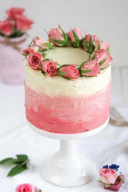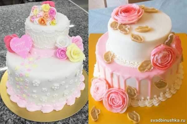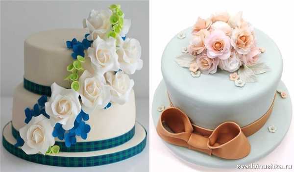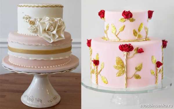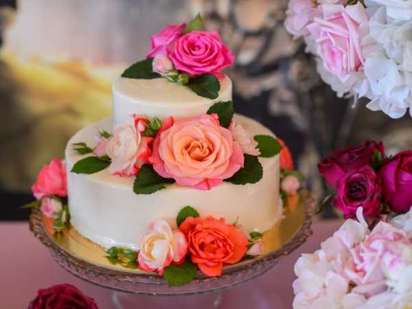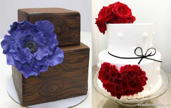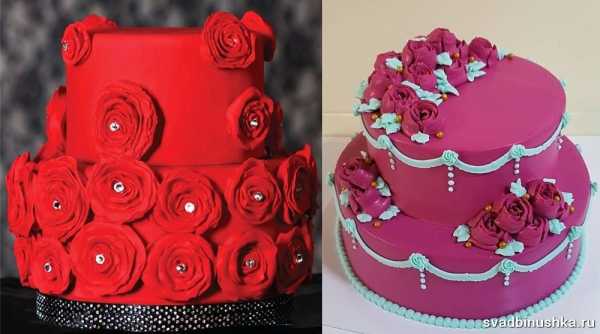 Свадебные торты в два яруса можно украсить крупными съедобными розами. Сделать их можно практически из любого сладкого материала и придать им цвет при помощи специальных пищевых красителей. Нередко их делают ярко-красными, светло-розовыми, фиолетовыми или синими.