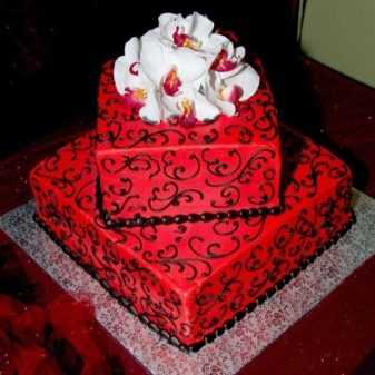 Многие люди сегодня для свадебных церемоний приобретают торты, оформленные в красной расцветке с квадратной формой каждого яруса. Данный вариант оформления считается интересным и сможет подойти даже для традиционного праздника. Такие десерты не следует слишком перегружать дополнительными украшениями и другими элементами, поскольку этот дизайн легко испортить лишними деталями.