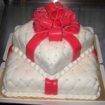 Торт не должен непременно быть круглым. Великолепно выглядят нестандартные десерты. Примером может служить торт, в форме двух подарочных коробочек, украшенных бантами.