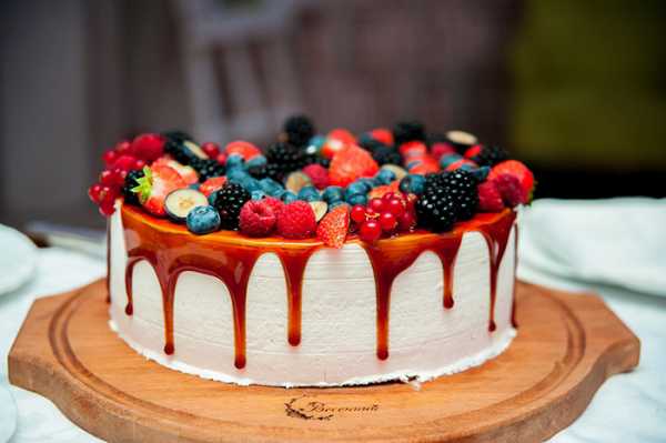Для тортов часто используют свежие ягоды и фрукты с фоном из ароматной карамели