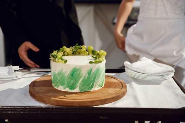 Одноярусный торт в бело-зеленых тонах, украшенный виноградом, станет красивым аккордом свадьбы в греческом стиле