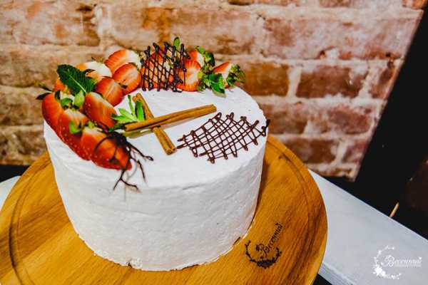 Для поклонников европейского стиля подойдет торт с белым кремом, украшенный клубникой и палочками корицы