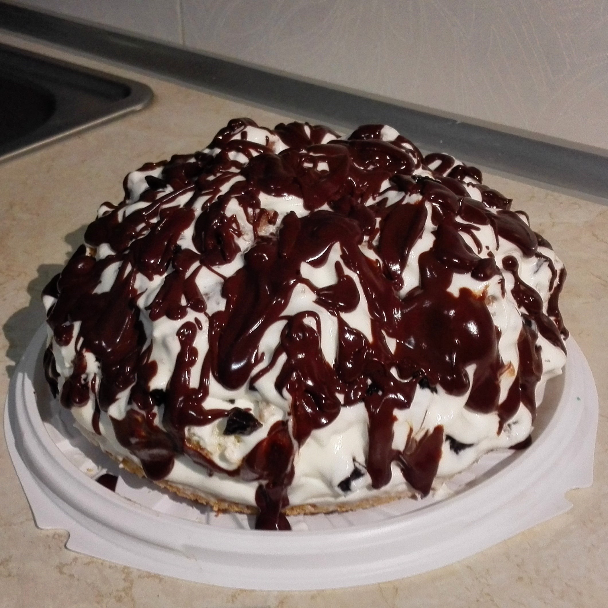 Торт с оригинальным сочетанием нежного бисквита, пропитанного сиропом и медовых коржей ,прослоенный сливочным кремом