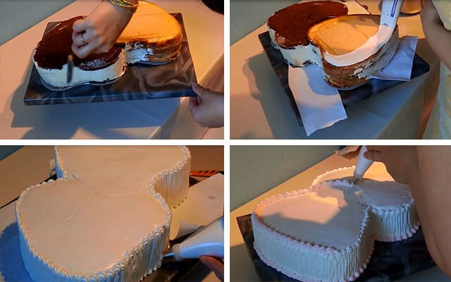 Торты, полностью покрытые мастикой, смотрятся особенно нарядно, поэтому хозяюшки пекут такие торты для торжественных случаев. Чтобы покрытие из мастики при этом смотрелось как можно более аккуратно, поверхность торта необходимо обязательно выровнять. Последовательность действий в общем случае будет такой.