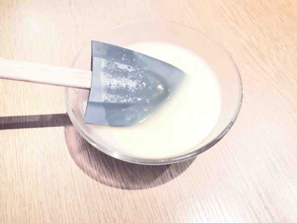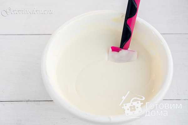 - В средней чаше залить теплой смесью белый шоколад и перемешивать силиконовой лопаткой до тех пор, пока он полностью не растает.