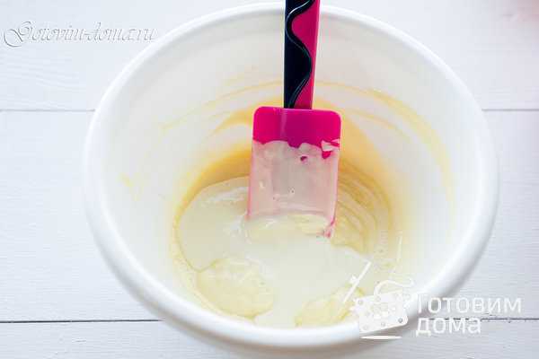 | Для этого на водяной бане взбить яйца с сахаром, около 10 мин. — до образования густой светло-жёлтой массы. |