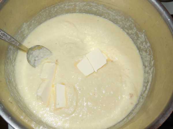 Дальше, снимаем крем с огня, добавляем в него сливочное масло и перемешиваем. Простой и вкусный заварной крем для торта Наполеон готов.