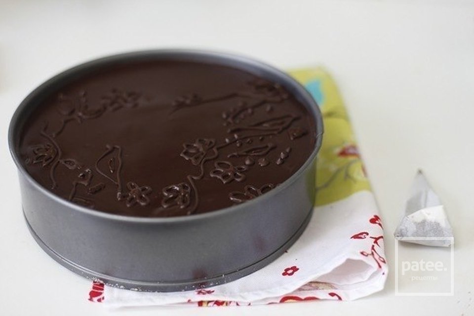 После того как поверхность станет твердой, залейте торт сверху теплой шоколадной глазурью и разровняйте. Снова отправьте в холодильник до застывания. | |