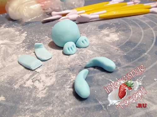 1. Катаем колобок из голубой мастики – это туловище. Ручки делаем из жгутиков, ножки − из чуть приплюснутых шариков с насечками.