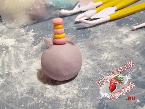 12. Приступить к лепке Совуньи из мультфильма. Для шапочки из небольших кусочков сахарной мастики розового и оранжевого оттенков скатать маленькие шарики. Приплюснуть и собрать в «башенку». В верхней части сделать рыхлую текстуру – это помпон. Полученную деталь приклеить к голове – туловищу сиреневого цвета. Слепить ушки из небольших кусочков мастики скатанных в горошины. Придать им треугольную форму и присоединить к основной заготовке (голове).
