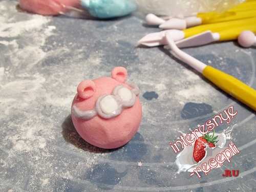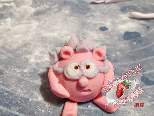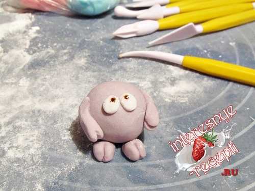 10. При помощи стека «сделать» Крошу улыбку. Для глаз скатать маленькие горошины и приплюснуть. Используя кисточку и обычную воду, приклеить глаза. В центре «оживить» глаза зрачками — небольшими точками при помощи кондитерского фломастера. Из розовой мастики скатать маленький шарик и приклеить в месте нахождения носа.
