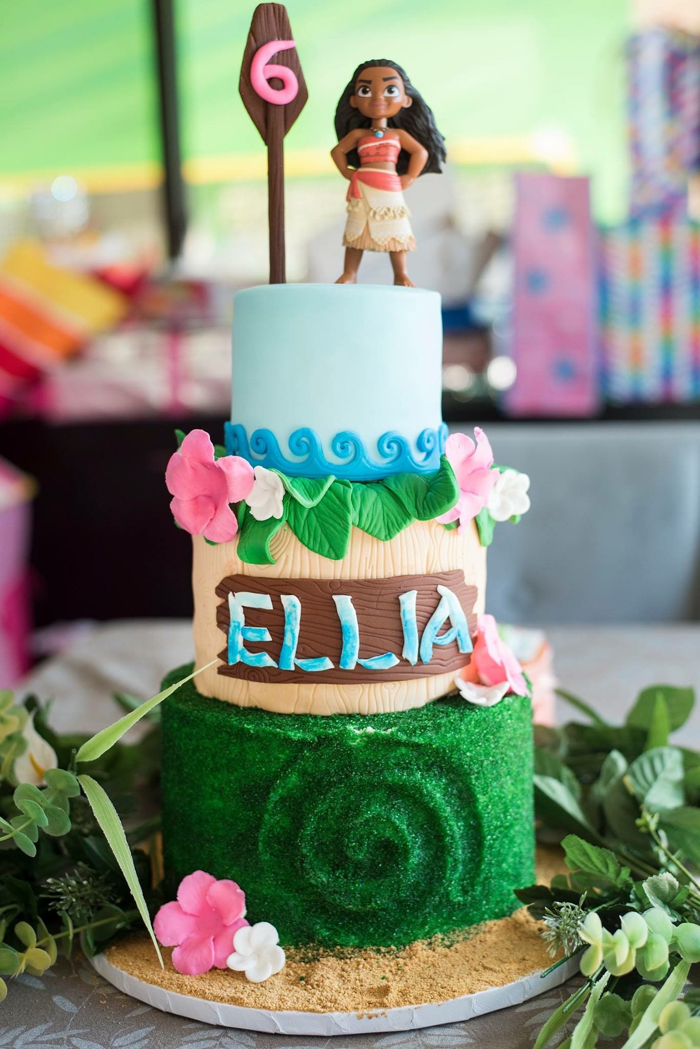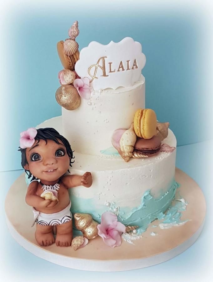 - для маленькой девочки и украшение должно быть совсем детским: фигурка малышки-Моаны, ее свинки Пуа, цветы и морские раковины;