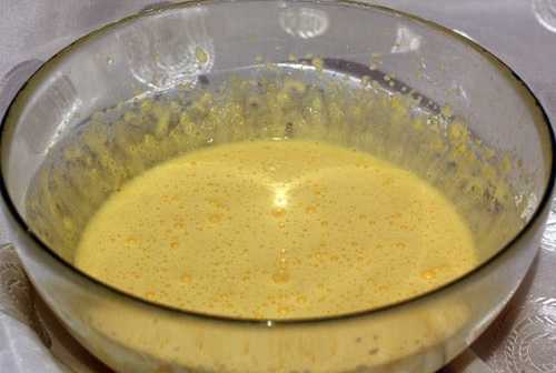 1. Желатин заливаем прохладной водой, перемешиваем и ждём около 40 минут, пока он растворится. В это время отделяем желтки от белков в отдельные глубокие мисочки. Затем желтки необходимо взбить миксером с добавлением сахарного песка. Должна получиться пенистая масса более светлого цвета, чем первоначально были желтки.