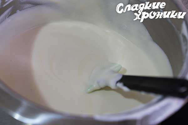 Когда шоколадная эмульсия остынет до 35-40 С, вводим в нее сливки частями, размешивая лопаткой.