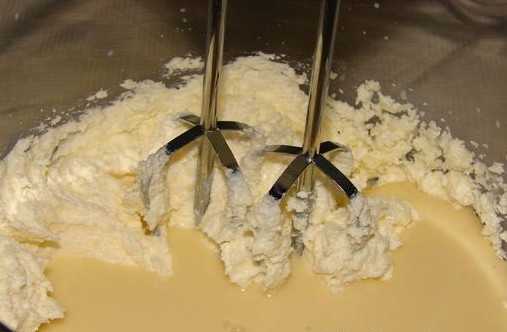 - Первым в миске взбивается сыр, затем добавляется сгущенный продукт.